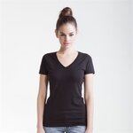 Modern cut v-neck T with elastane for improved fit, comfort and shape retention. Shaped side seams. Modern soft, narrow-rib at v-neck.